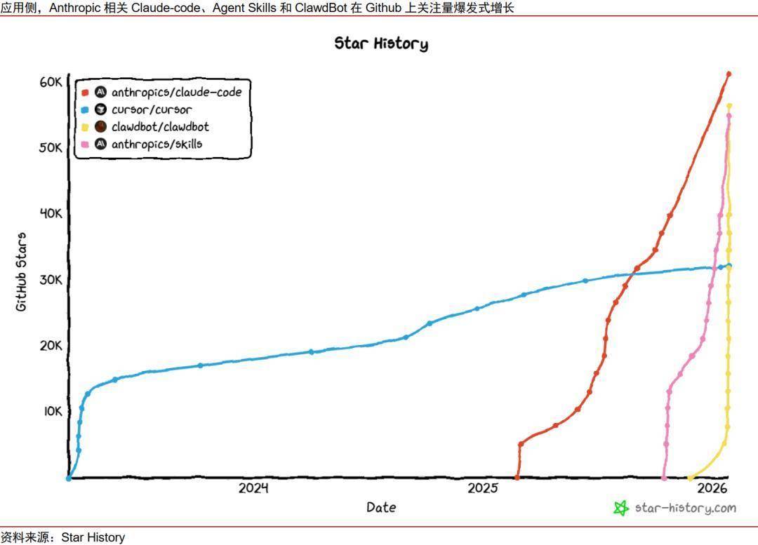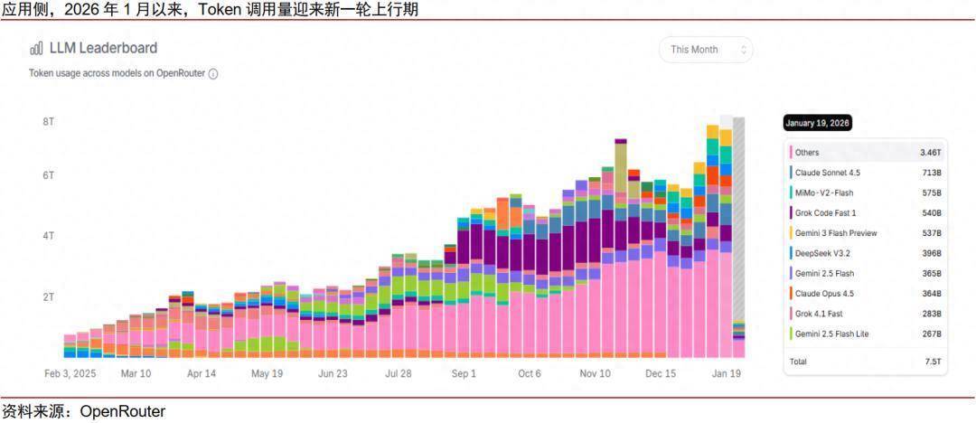 近期,AI智能体应用MoltBot(原ClawdBot)迅速出圈,AI Agent继续向前迈进一步,能够获得电脑操作的更高权限,并能够处理更复杂场景的任务,同时也带来更多算力消耗。而Anthropic发布的Claude Code、Agent Skills、Claude Cowork、Claude in Excel等一些列产品亦扩展了Agent落地的使用场景。从实际使用数据来看,根据OpenRouter,自2026年1月初起, Token调用量已连续2–3周保持高速增长,AI应用使用量持续攀升。根据The Information,Anthropic上调2026和2027年营收预期分别至180亿美元和550亿美元。类比上一轮Gemini带来谷歌云的繁荣,Anthropic的云服务供应商亦有望迎来推理需求的迅速上行。